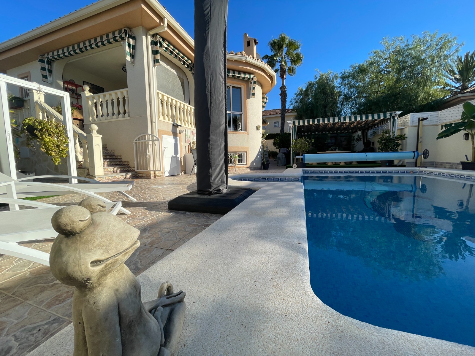 La propiedad cuenta con paneles solares que optimizan el consumo energético, así como una bomba de calefacción para la piscina, perfecta para disfrutar del agua durante todo el año.